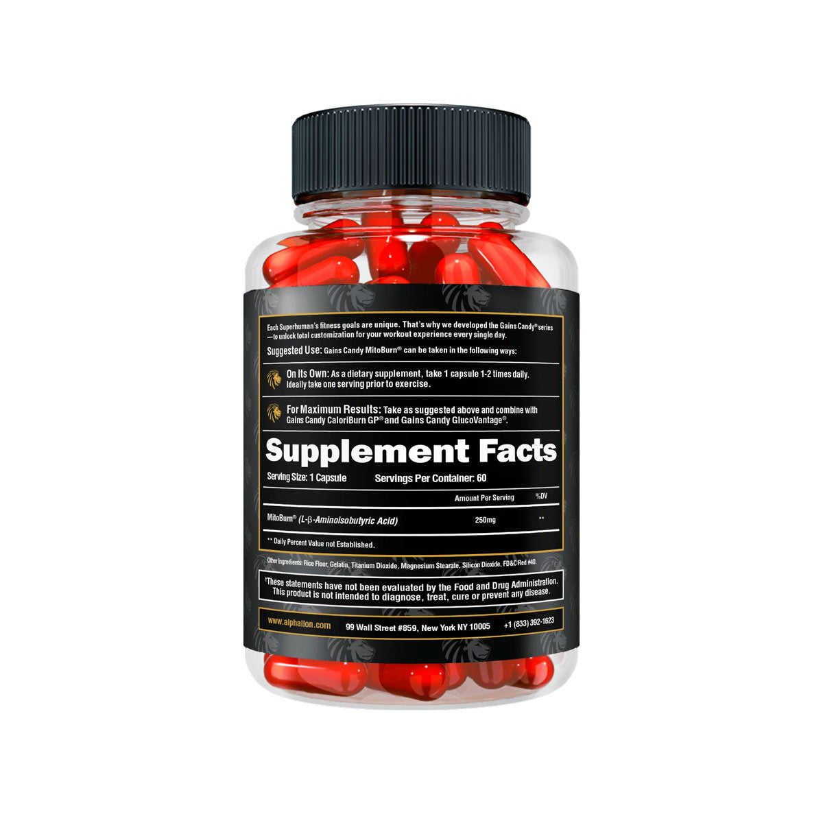 MitoBurn™ is a newer and verified form of L-BAIBA. This is apart of Alpha Lions Commodity, single ingredient line, Gains Candy Series.