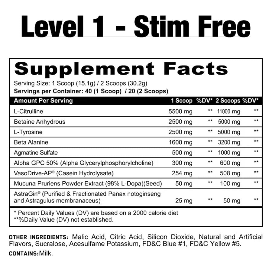 Level 1 is designed for those seeking a non-stimulant pre-workout experience, perfect for individuals looking to enhance their workouts without the stims.