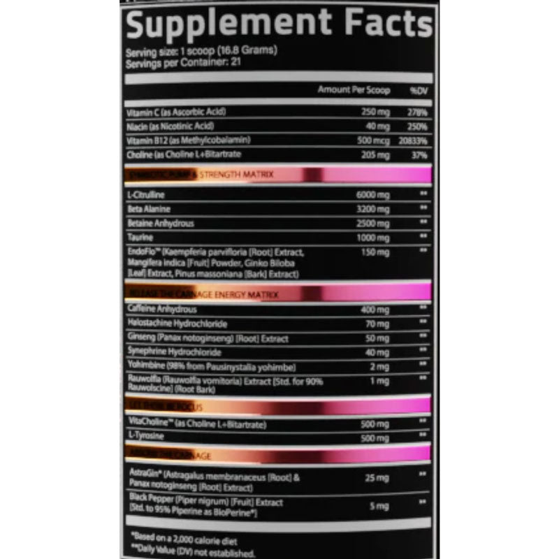 Carnage Pre Workout - 21 Servings / Snow Cones is backordered and will ship as soon as it is back in stock.