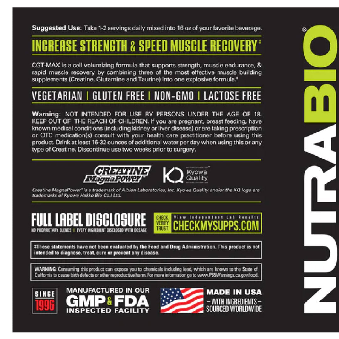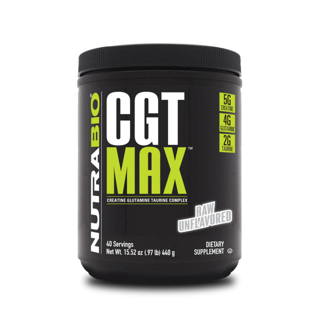 NutraBio CGT-MAX is a cell volumizing formula that supports Strength, Power, and Rapid Muscle Recovery. CGT-MAX is an advanced workout supplement combining three of the most effective muscle-building ingredients (Creatine, Glutamine, and Taurine) into one explosive formula, providing your muscles with optimized performance for maximum gains and quick muscle recovery from intense workouts. With CGT-MAX, you’ll experience faster recovery from your workouts with less soreness while improving neuromuscular efficiency.