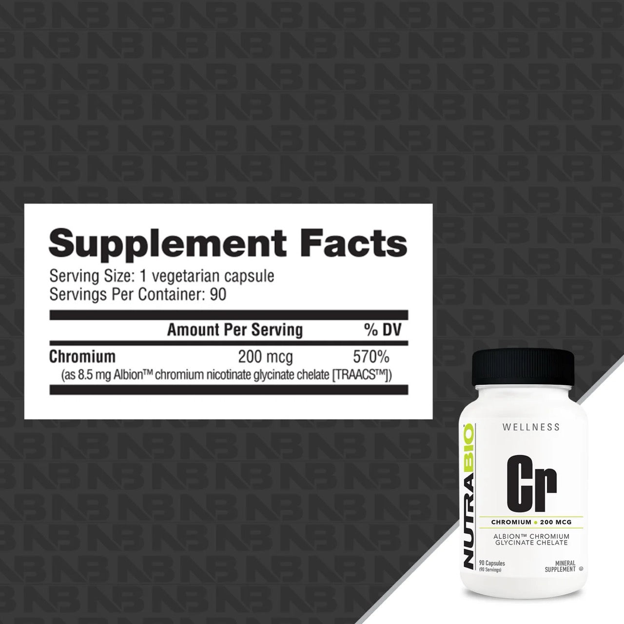 NutraBio Chromium uses a unique and patented form of chromium, chelated with the L form of the amino acid glycine. This chelation process aids in maximum assimilation and absorption, allowing the chromium to be more effectively transported and utilized throughout the body.