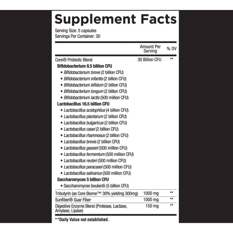 The gut, or gastrointestinal (GI) tract is one of the largest systems responsible for keeping our body in working order. Food and a wide variety of nutrients pass through the separate parts, being broken down and absorbed only to be shuttled to their final destination to begin to do their job. In addition to this food, countless numbers of microorganisms from the environment pass through the gut – some of which may be detrimental to health and alter the integrity of the GI tract. Core GUT was formulated to provide all around GI tract support with beneficial bacteria in a custom probiotic blend, a useable form of food for these microorganisms in a prebiotic, beneficial by-products in a post biotic, and digestive enzymes to aid in the breakdown of crucial nutrients. This combination of ingredients has been shown to support the growth of healthy gut bacteria*, enhance immune function*, provide support for gut lining integrity*, and display protective effects on gut environment*.