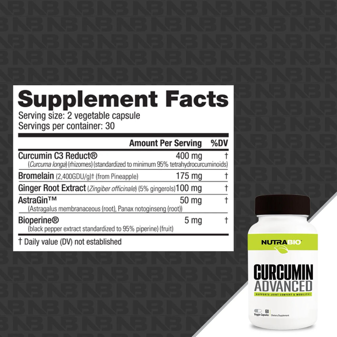 In addition to curcumin, NutraBio included Ginger Root Extract for its digestive properties and benefits to gut health. We included bromelain, a protein-digesting enzyme that aids in digestive health as well. Last but not least, NutraBio added in the two most clinically studied ingredients for increasing bioavailability, Astragin and Bioperine to maximize the absorption of all the nutrients included in Curcumin Advanced.