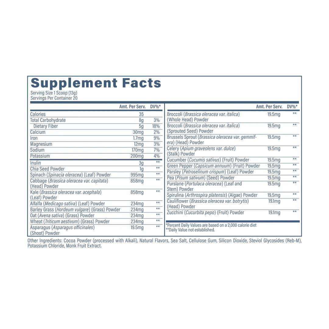 Daily Greens superfood powder is gluten-free and dairy-free. Available in chocolate and berry flavors.