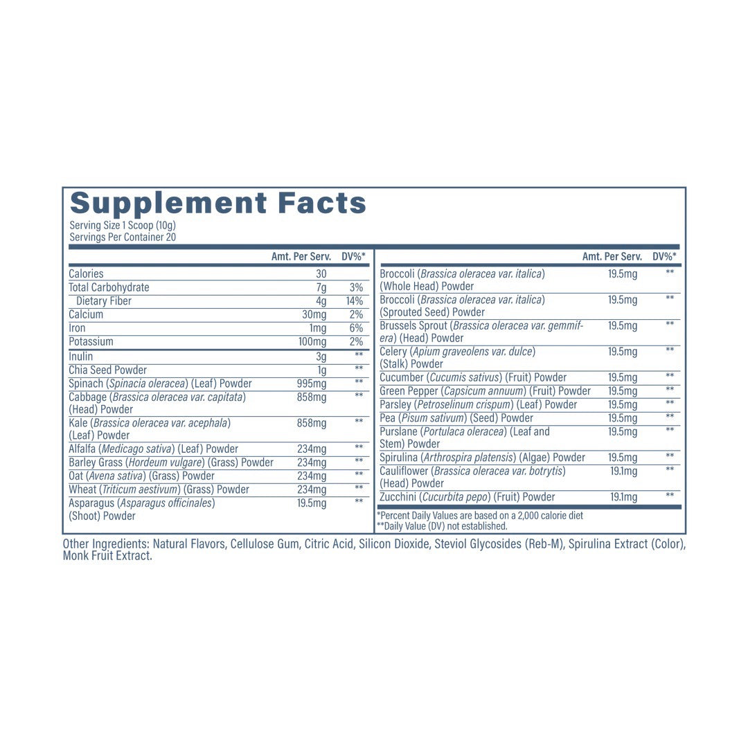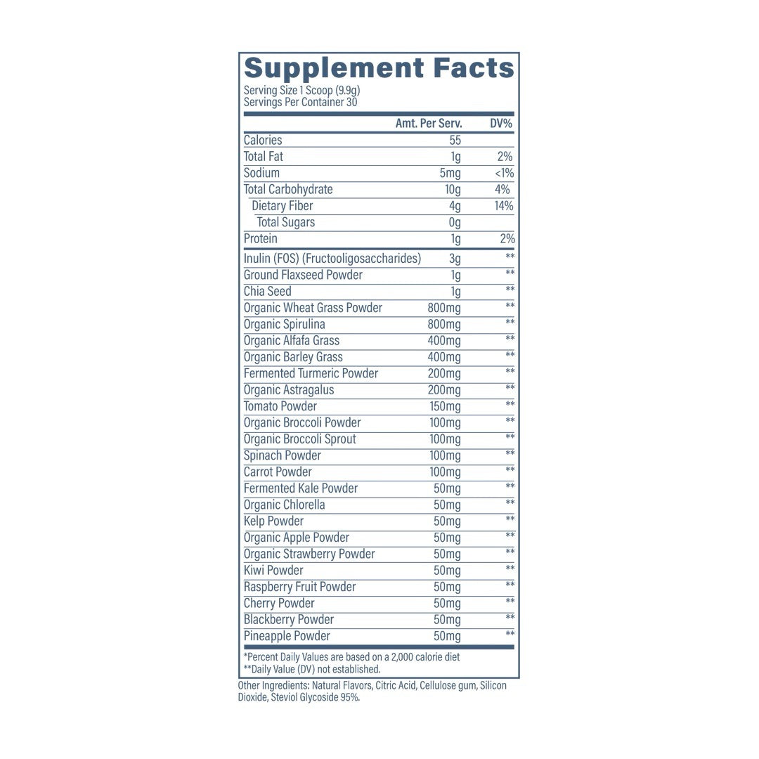 Daily Greens superfood powder has been formulated for those with diets low in fruits and vegetables. If your daily intake of fruits and vegetables is lower than the recommended amount, this supplement is for you. Daily use of this naturally-derived formula helps increase fiber intake, and serves as a high ORAC (oxygen radical absorbance capacity) blend.