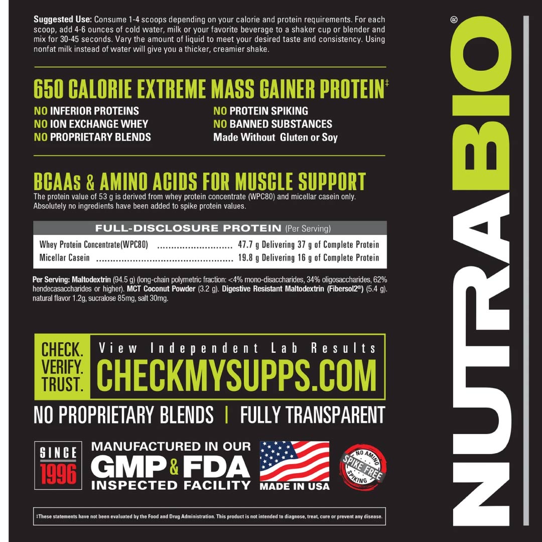 NutraBio Extreme Mass provides you with a clean mass gainer loaded with 53g of premium protein and 100g of quality carbs. Best of all, Extreme Mass is low in sugar, setting the industry standard for what a mass gainer should look like.
