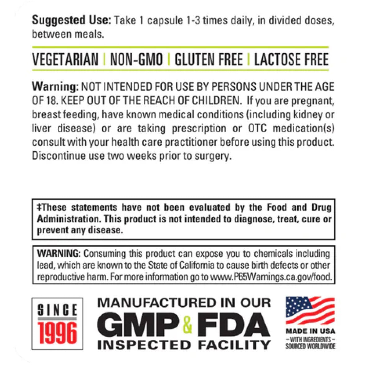 NOT INTENDED FOR USE BY PERSONS UNDER THE AGE OF 18. KEEP OUT OF THE REACH OF CHILDREN. If you are pregnant, breast feeding, have known medical conditions (including kidney or liver disease) or are taking prescription or OTC medication(s) consult with your health care practitioner before using this product. Discontinue use two weeks prior to surgery.