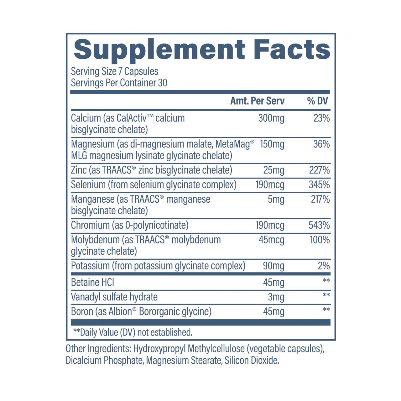 Revive Multi Mineral was formulated to provide comprehensive mineral support. Each serving of Revive's multimineral supplement delivers an ideal balance of highly-absorbed minerals, coupled with the benefits of betaine HCl. This blend was designed to provide bioavailable forms of key minerals in one convenient supplement that help promote important biological reactions in the body.