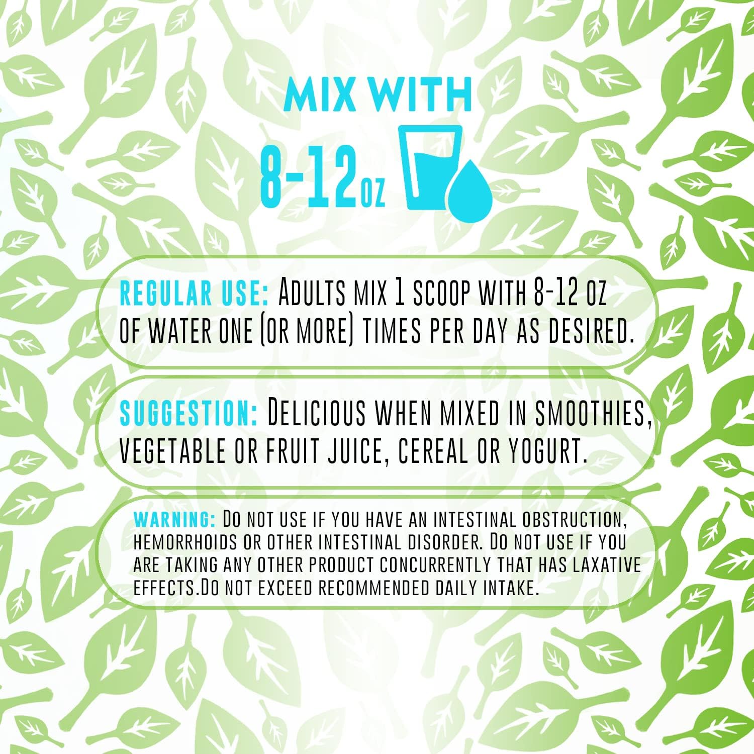 Consult your physician before using this or any product if you are pregnant, nursing, trying to conceive, taking medication or have a medical condition. Check with your doctor before using this product if you are using medication, including diuretics, heart medications and corticosteroids, or have any medical conditions. Do not use if you have an intestinal obstruction, hemorrhoids or other intestinal disorder. Do not use if you are taking any other product concurrently that has laxative effects. Do not exceed recommended daily intake. Not intended for use by persons under 18. Keep out of reach of children. Store in a cool, dry place. Taking this product without adequate water may cause choking.