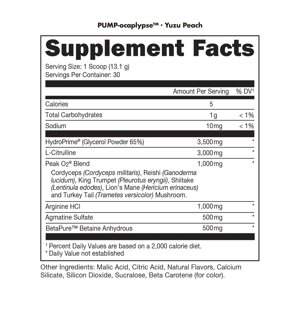 Pump Ocalypse is DAS Labs (Bucked Up Brand) pump powder supplement. This is meant to either stack with another stimulant pre workout or to be taken when cycling off stimulant pre workouts.