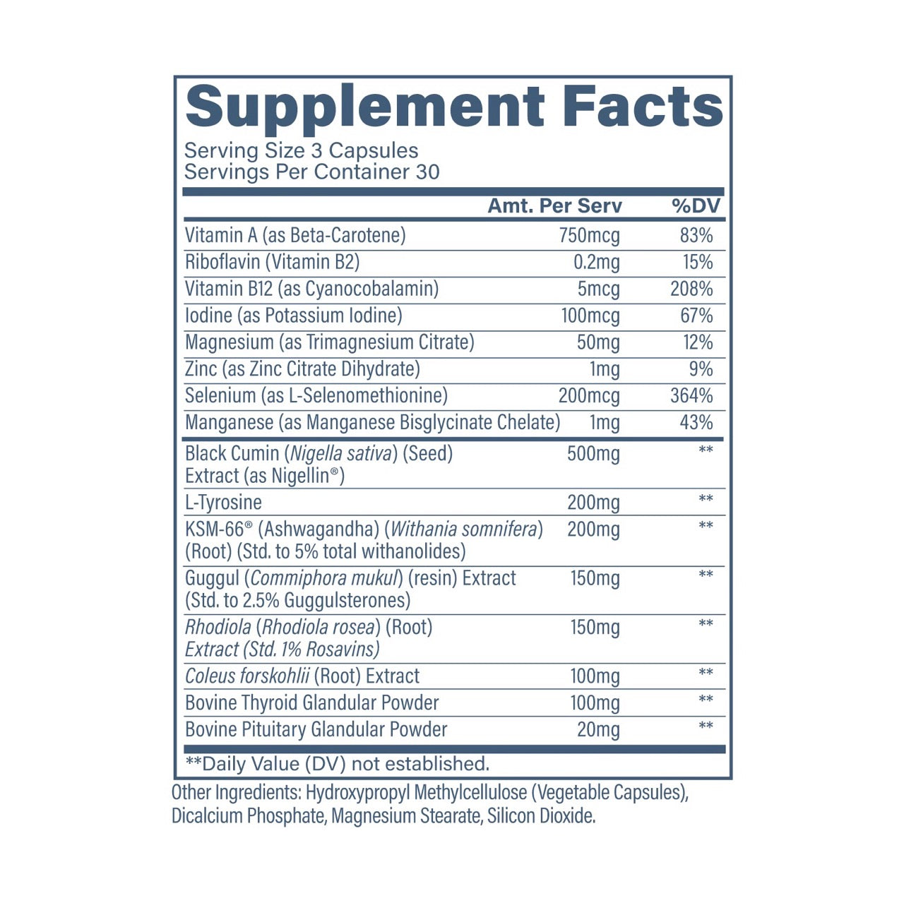 Revive Supplements Thyroid Support formula contains key ingredients for healthy thyroid function including iodine and tyrosine which the body uses to manufacture thyroid hormones (T3 and T4). In addition, our thyroid support formula includes minerals like selenium and zinc which are used in the conversion of T3 to T4